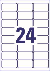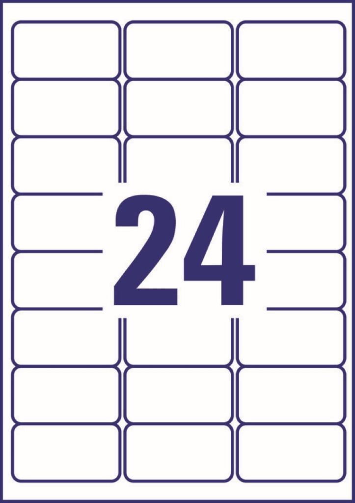 rozměr 63,5×33,9 mm, 20 archů A4, 480 ks etiket v balení (24 ks/arch), akrylová fólie, permanentní lepidlo, barva bílá. Typ tiskárny: černobílá laserová.