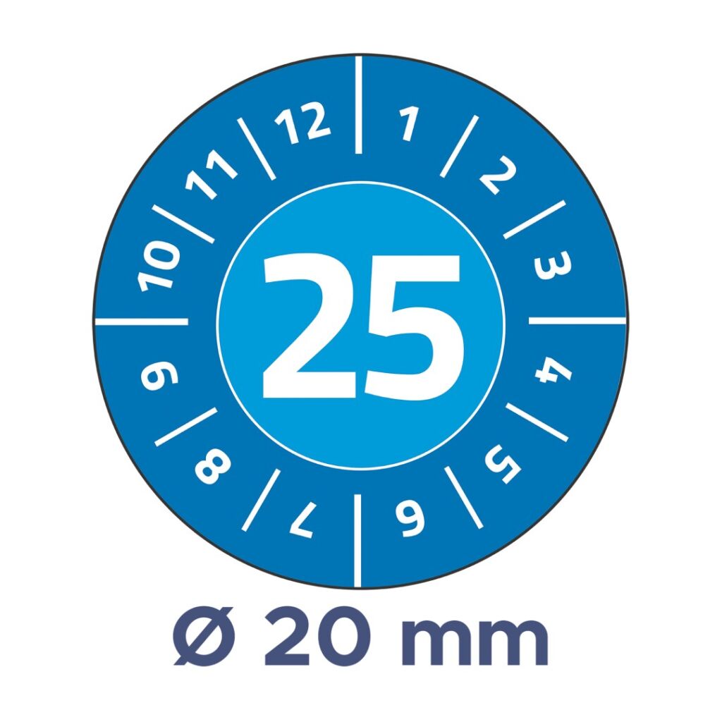 průměr 20 mm, 120 ks etiket v balení, odolná akrylová fólie, permanentní lepidlo, barva modrá se symboly číslic měsíců 1-12 a letopočtu 2025.