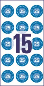 průměr 20 mm, 120 ks etiket v balení, akrylová fólie, permanentní lepidlo, barva modrá se symboly číslic měsíců 1-12 a letopočtu 2025.
