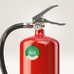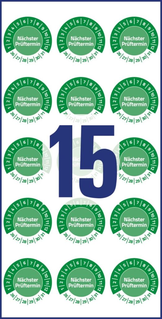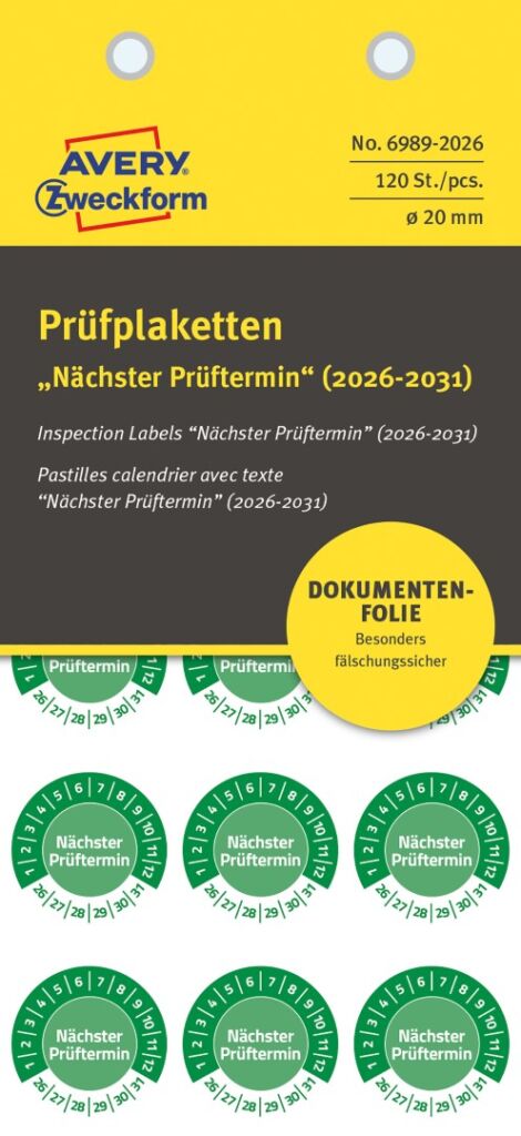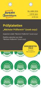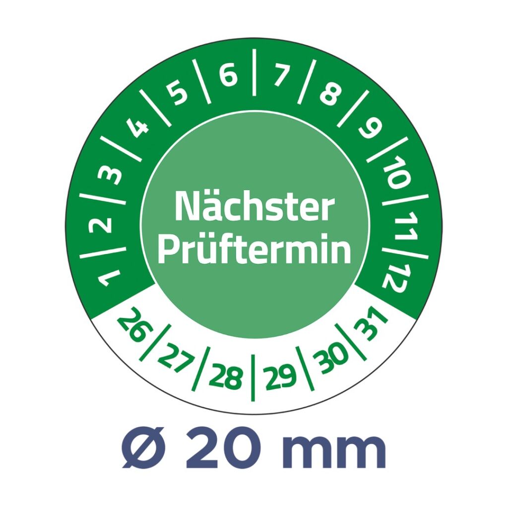 průměr 20mm, 120 ks etiket v balení, akrylová fólie, permanentní lepidlo, barva zelená s nápisem “Nächster Prüftermin“, číslicemi měsíců 1-12 a letopočtů 2026-2031.