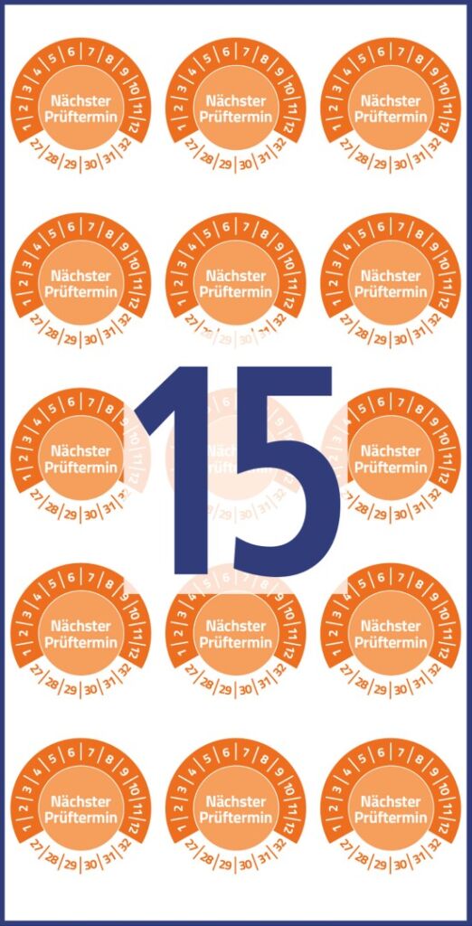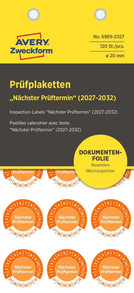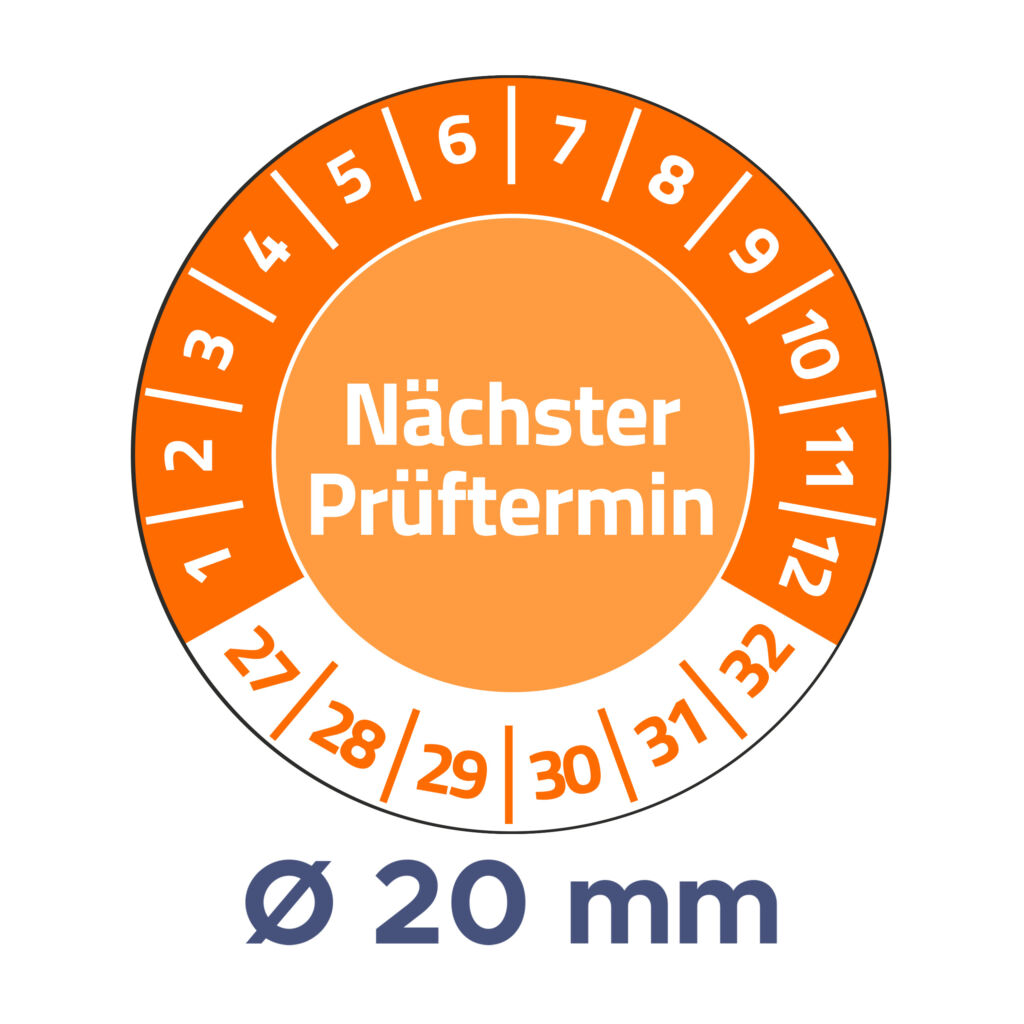 průměr 20mm, 120 ks etiket v balení, akrylová fólie, permanentní lepidlo, barva oranžová s nápisem “Nächster Prüftermin“, číslicemi měsíců 1-12 a letopočtů 2027-2032.
