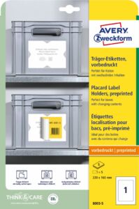 Nosné samolepící etikety Avery Zweckform 8002-5 pro efektivní a profesionální označování ve skladech a logistice! Máte problém s často se měnícím značením euroboxů, regálů, kontejnerových boxů, přepravních beden a jiných skladovacích nádob? Odstraňování štítků často zanechává nevzhledné zbytky etiket nebo lepidla? Máme pro Váš řešení! Naše inovativní nosné etikety se speciální povrchovou úpravou, jako aplikační plocha pro opakované použití s Vašimi etiketami! Na krabici se na požadované místo nalepí nosná etiketa. Nyní na tuto nosnou etiketu nalepíte svou samolepící etiketu, kterou mohou být všechny druhy standardních samolepících etiket. Chcete změnit obsah/sklad a tím i způsob označení? Žádný problém! Jednoduše odstraňte samolepku z nosné etikety a nalepte novou! Díky speciální povrchové úpravě nosné etikety je odstranění velmi snadné, čisté a beze zbytků lepidla! Jak to celé funguje? Podívejte se na Videa (záložka výše).