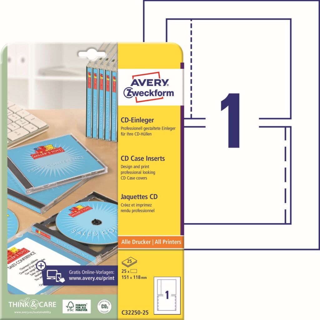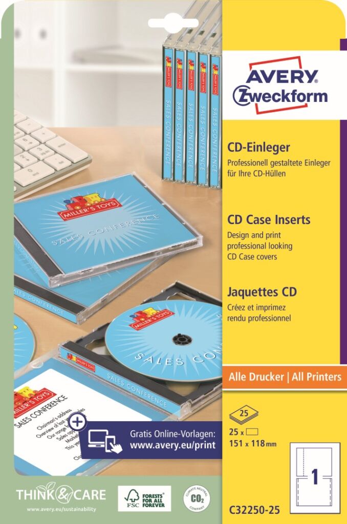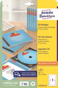 Obaly na CD Avery Zweckform C32250-25 jsou ideální na standardní rozměr plastové krabičky na CD. Ať už pro Vaše obchodní partnery nebo přátele či rodinu, s našimi přebaly na CD vytvoříte během chvilky originální obal s profesionálním vzhledem. Přední i zadní strana přebalu na jednom listu. Okraje a ohyby s velmi jemnou mikroperforací, která zajistí čisté oddělování a snadné ohýbání. Při tisku se můžete spolehnout na plynulý průjezd archů tiskárnou bez uvíznutí a ostrý tiskový výstup, který se díky vynikajícímu přilnutí tonerového prášku či inkoustu nerozmazává. Potisknutelné přebaly na CD krabičky Avery C32250-25 jsou vhodné pro všechny běžné laserové i inkoustové tiskárny, kopírovací stroje a hodí se i pro psaní, resp. ruční popis.