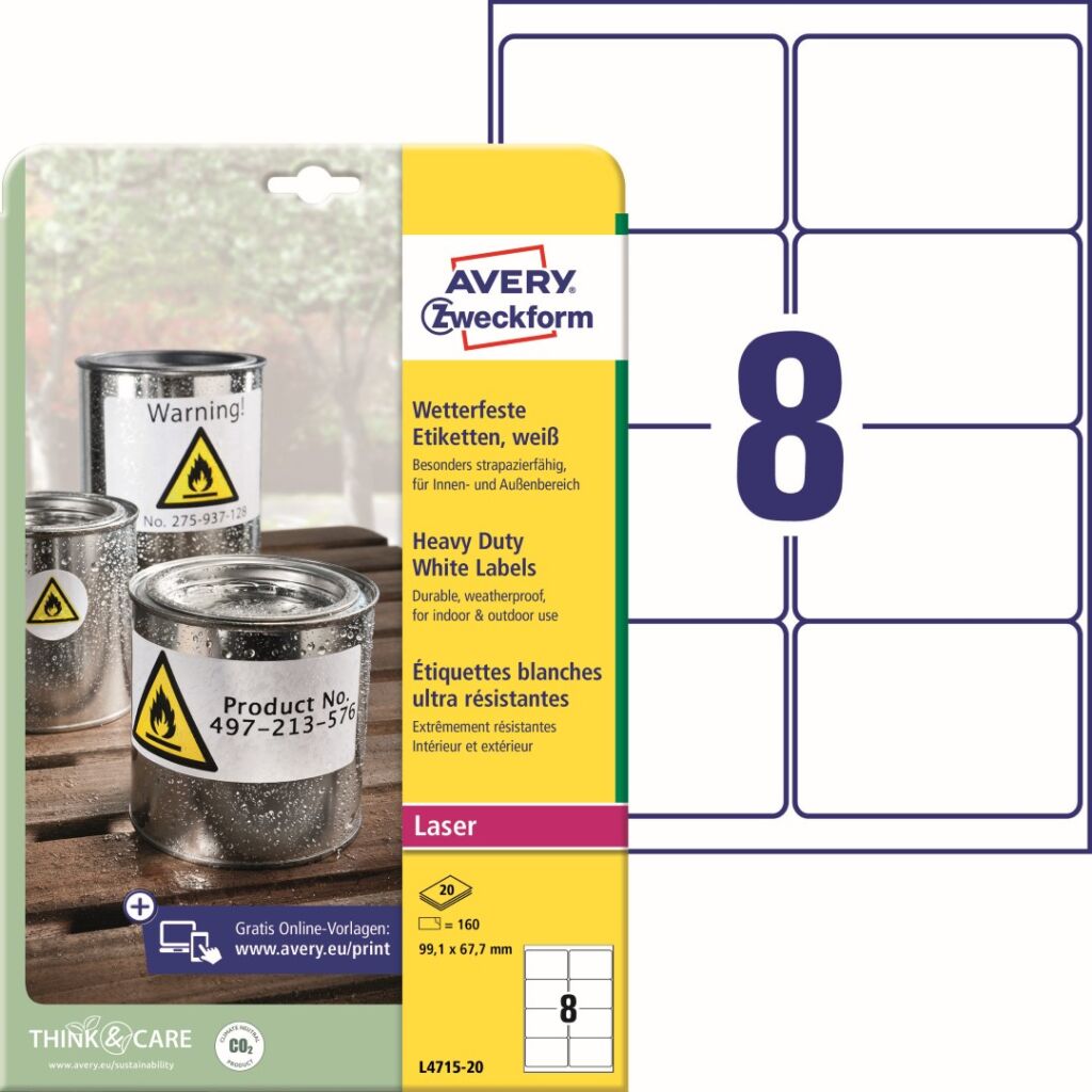 Odolné samolepící etikety Avery Zweckform L4715-20 do náročných venkovních podmínek. Ideální na trvalé a dlouhodobé značení, vnitřní i venkovní označování předmětů, výrobků, majetku, skladových regálů, palet atd. Vysoká a stálá lepivost na nejrůznějších typech povrchů. Bílé polyesterové etikety jsou odolné vůči stříkající vodě, nečistotám, mastnotě, roztržení, UV záření a teplotám od -20°C do +80°C. Při tisku se můžete spolehnout na plynulý průjezd archů tiskárnou bez uvíznutí a ostrý tiskový výstup, který se díky vynikajícímu přilnutí tonerového prášku nerozmazává. Počasí odolné PET etikety Avery Zweckform L4715-20 jsou vhodné pro všechny běžné černobílé a barevné laserové tiskárny a kopírovací stroje.