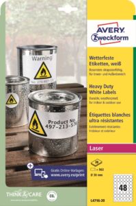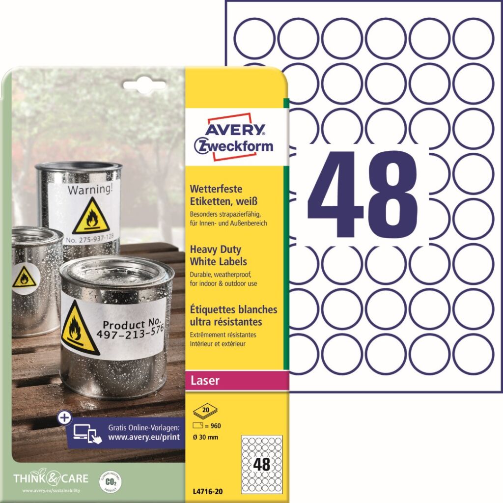 Kulaté odolné etikety Avery Zweckform L4716-20 do náročných venkovních podmínek. Ideální na trvalé a dlouhodobé značení, vnitřní i venkovní označování předmětů, výrobků, majetku, skladových regálů, palet atd. Vysoká a stálá lepivost na nejrůznějších typech povrchů. Bílé polyesterové etikety jsou odolné vůči stříkající vodě, nečistotám, mastnotě, roztržení, UV záření a teplotám od -20°C do +80°C. Při tisku se můžete spolehnout na plynulý průjezd archů tiskárnou bez uvíznutí a ostrý tiskový výstup, který se díky vynikajícímu přilnutí tonerového prášku nerozmazává. Počasí odolné PET etikety Avery Zweckform L4716-20 jsou vhodné pro všechny běžné černobílé a barevné laserové tiskárny a kopírovací stroje.