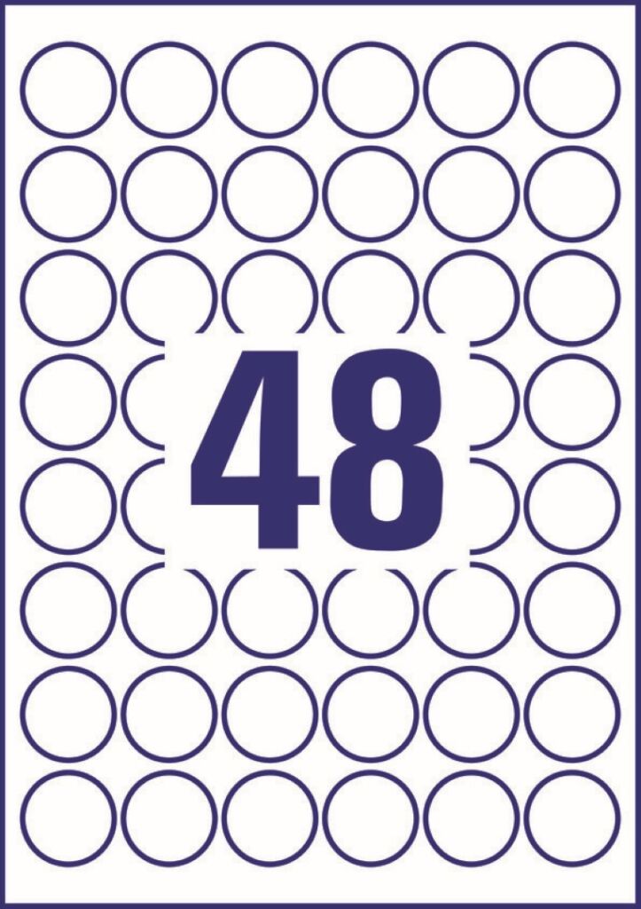 průměr 30 mm, 20 archů A4, 960 ks etiket v balení (48 ks/arch), PET fólie, permanentní lepidlo, barva bílá. Typ tiskárny: černobílá laserová, barevná laserová.