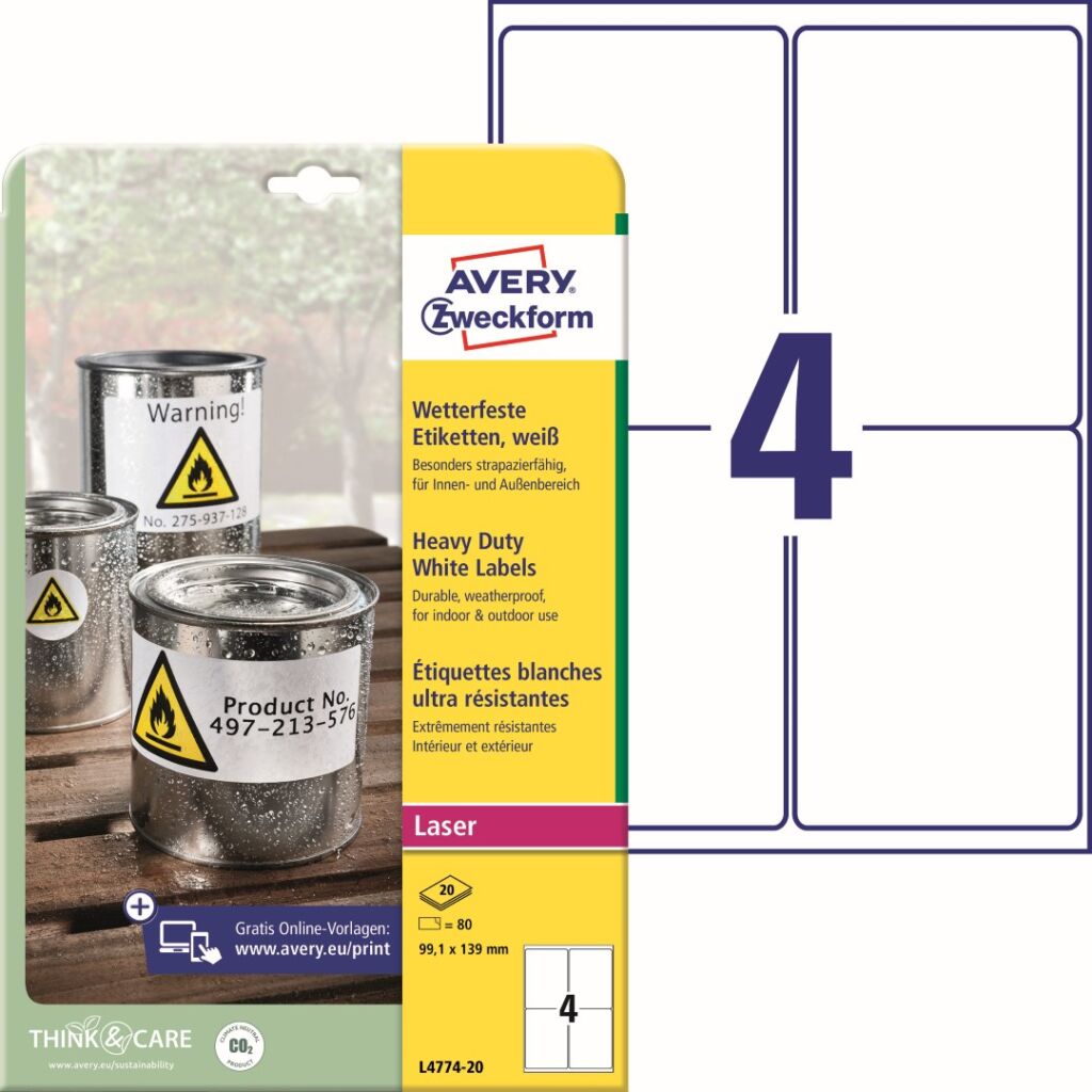 Odolné samolepící etikety Avery Zweckform L4774-20 do náročných venkovních podmínek. Ideální na trvalé a dlouhodobé značení, vnitřní i venkovní označování předmětů, výrobků, majetku, skladových regálů, palet atd. Vysoká a stálá lepivost na nejrůznějších typech povrchů. Bílé polyesterové etikety jsou odolné vůči stříkající vodě, nečistotám, mastnotě, roztržení, UV záření a teplotám od -20°C do +80°C. Při tisku se můžete spolehnout na plynulý průjezd archů tiskárnou bez uvíznutí a ostrý tiskový výstup, který se díky vynikajícímu přilnutí tonerového prášku nerozmazává. Počasí odolné PET etikety Avery Zweckform L4774-20 jsou vhodné pro všechny běžné černobílé i barevné laserové tiskárny a kopírovací stroje.