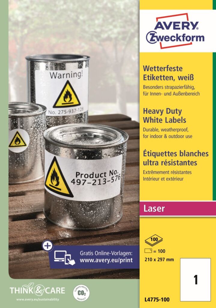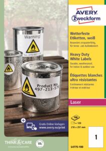Odolné samolepící etikety Avery Zweckform L4775-100 do náročných venkovních podmínek. Ideální na trvalé a dlouhodobé značení, vnitřní i venkovní označování předmětů, výrobků, majetku, skladových regálů, palet atd. Vysoká a stálá lepivost na nejrůznějších typech povrchů. Bílé polyesterové etikety jsou odolné vůči stříkající vodě, nečistotám, mastnotě, roztržení, UV záření a teplotám od -20°C do +80°C. Při tisku se můžete spolehnout na plynulý průjezd archů tiskárnou bez uvíznutí a ostrý tiskový výstup, který se díky vynikajícímu přilnutí tonerového prášku nerozmazává. Arch má ze zadní strany tzv. rovný split, což je násek nosného papíru pro snadnější sejmutí etikety. Počasí odolné PET etikety Avery Zweckform L4775-100 jsou vhodné pro všechny běžné černobílé a barevné laserové tiskárny a kopírovací stroje.