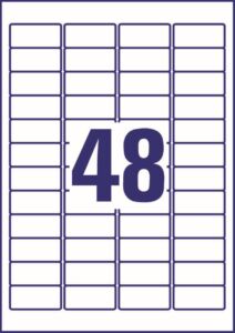 8 archů A4, rozměr 45,7x21,2 mm, 384 ks etiket v balení, odolná polyesterová fólie, permanentní lepidlo, barva bílá. Typ tiskárny: černobílá laserová, barevná laserová.
