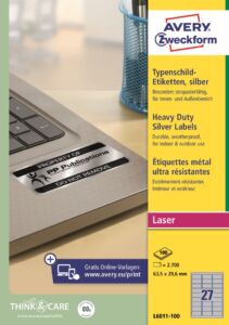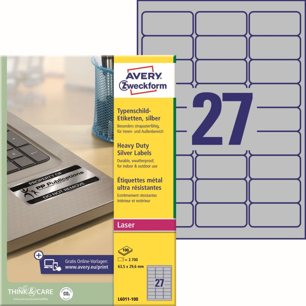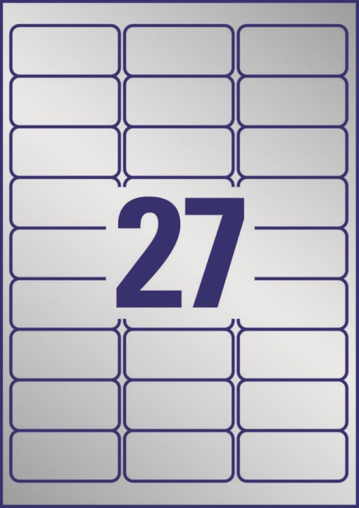 rozměr 63,5×29,6 mm, 100 archů A4, 2.700 ks etiket v balení (27 ks/arch), PET fólie, permanentní lepidlo, barva stříbrná. Typ tiskárny: černobílá laserová.