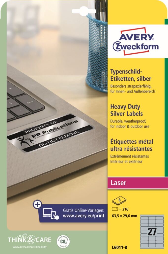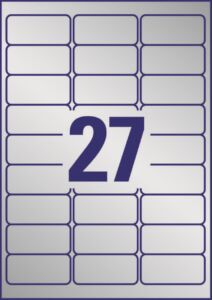 rozměr 63,5×29,6 mm, 8 archů A4, 216 ks etiket v balení (27 ks/arch), PET fólie, permanentní lepidlo, barva stříbrná. Typ tiskárny: černobílá laserová.