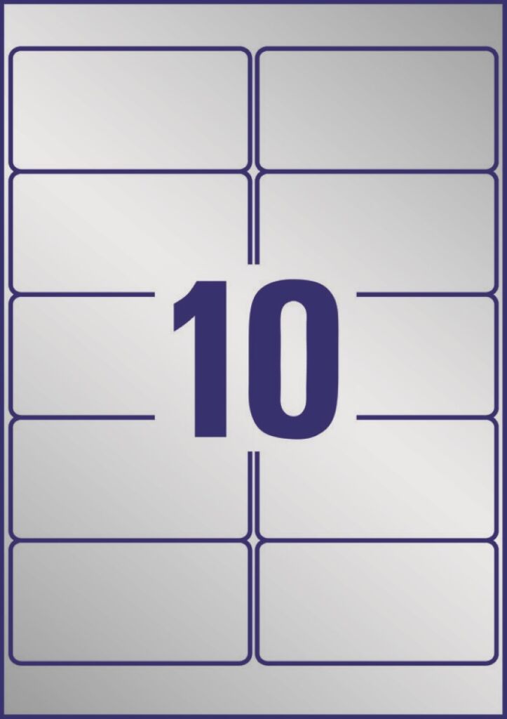 rozměr 96×50,8 mm, 20 archů A4, 200 ks etiket v balení (10 ks/arch), PET fólie, permanentní lepidlo, barva stříbrná. Typ tiskárny: černobílá laserová.