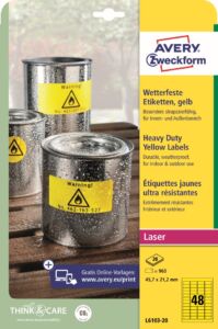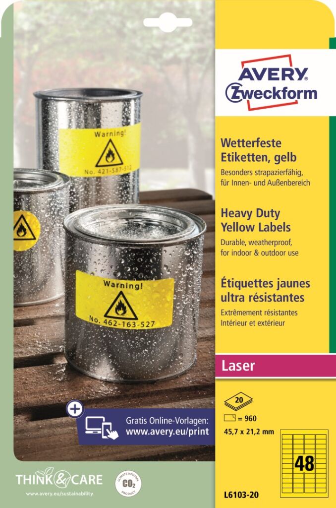 Odolné samolepící etikety Avery Zweckform L6103-20 do náročných venkovních podmínek. Ideální na trvalé a dlouhodobé značení, vnitřní i venkovní označování předmětů, výrobků, majetku, skladových regálů, palet atd. Vysoká a stálá lepivost na nejrůznějších typech povrchů. Žluté polyesterové etikety jsou odolné vůči stříkající vodě, nečistotám, mastnotě, roztržení, UV záření a teplotám od -20°C do +80°C. Při tisku se můžete spolehnout na plynulý průjezd archů tiskárnou bez uvíznutí a ostrý tiskový výstup, který se díky vynikajícímu přilnutí tonerového prášku nerozmazává. Počasí odolné PET etikety Avery Zweckform L6103-20 jsou vhodné pro všechny běžné černobílé laserové tiskárny a kopírovací stroje.