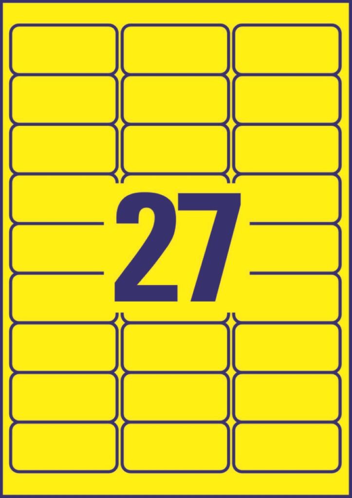 rozměr 63,5×29,6 mm, 20 archů A4, 540 ks etiket v balení (27 ks/arch), PET fólie, permanentní lepidlo, barva žlutá. Typ tiskárny: černobílá laserová.