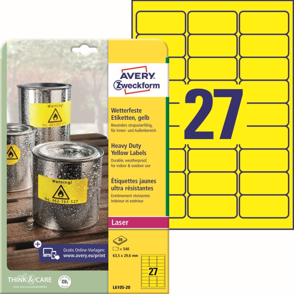 Odolné samolepící etikety Avery Zweckform L6105-20 do náročných venkovních podmínek. Ideální na trvalé a dlouhodobé značení, vnitřní i venkovní označování předmětů, výrobků, majetku, skladových regálů, palet atd. Vysoká a stálá lepivost na nejrůznějších typech povrchů. Žluté polyesterové etikety jsou odolné vůči stříkající vodě, nečistotám, mastnotě, roztržení, UV záření a teplotám od -20°C do +80°C. Při tisku se můžete spolehnout na plynulý průjezd archů tiskárnou bez uvíznutí a ostrý tiskový výstup, který se díky vynikajícímu přilnutí tonerového prášku nerozmazává. Počasí odolné PET etikety Avery Zweckform L6105-20 jsou vhodné pro všechny běžné černobílé laserové tiskárny a kopírovací stroje.