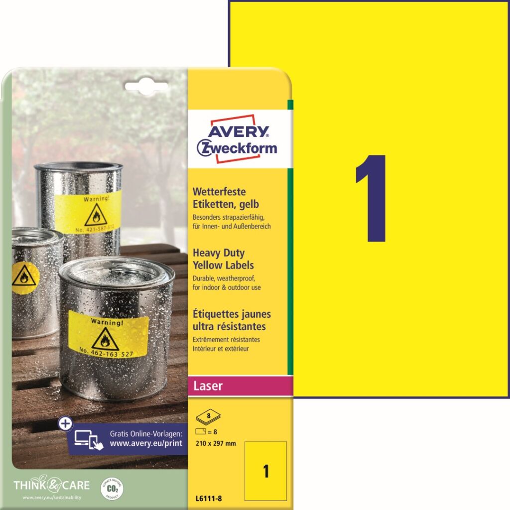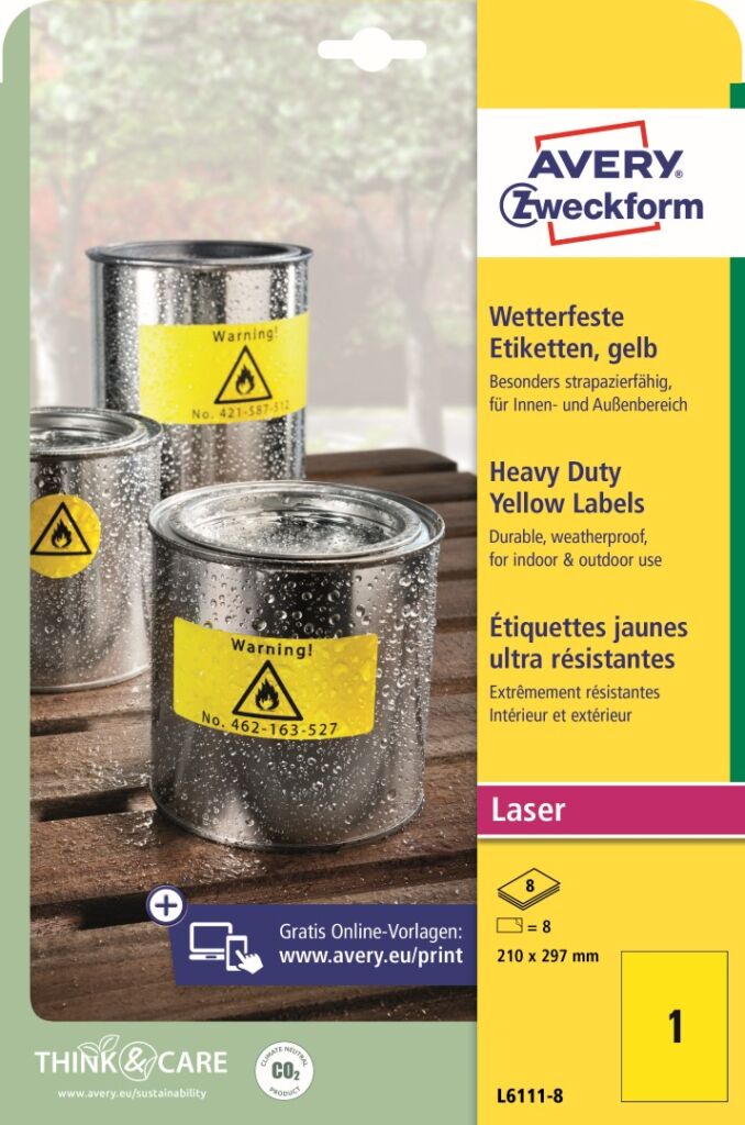 Odolné samolepící etikety Avery Zweckform L6111-8 do náročných venkovních podmínek. Ideální na trvalé a dlouhodobé značení, vnitřní i venkovní označování předmětů, výrobků, majetku, skladových regálů, palet atd. Vysoká a stálá lepivost na nejrůznějších typech povrchů. Žluté polyesterové etikety jsou odolné vůči stříkající vodě, nečistotám, mastnotě, roztržení, UV záření a teplotám od -20°C do +80°C. Při tisku se můžete spolehnout na plynulý průjezd archů tiskárnou bez uvíznutí a ostrý tiskový výstup, který se díky vynikajícímu přilnutí tonerového prášku nerozmazává. Arch má ze zadní strany tzv. split, což je násek nosného papíru pro snadnější sejmutí etikety. Počasí odolné PET etikety Avery Zweckform L6111-8 jsou vhodné pro všechny běžné černobílé laserové tiskárny a kopírovací stroje.
