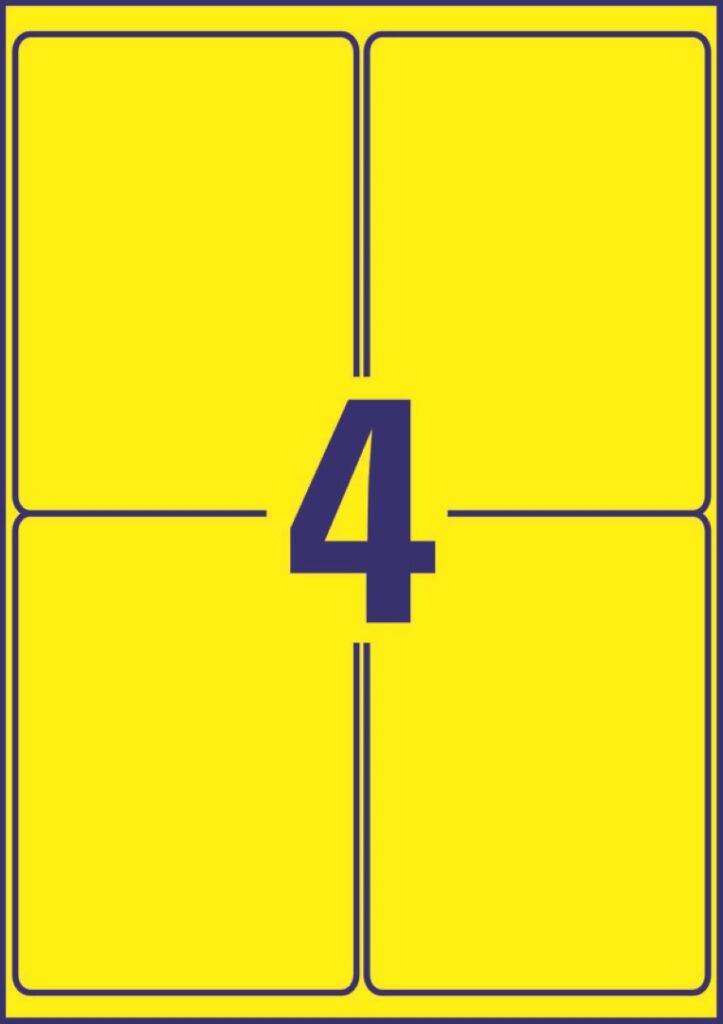 20 archů A4, rozměr 99,1x139 mm, 80 ks etiket v balení, odolná polyesterová fólie, permanentní lepidlo, barva žlutá. Typ tiskárny: černobílá laserová.