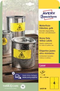 Odolné samolepící etikety Avery Zweckform L6127-20 do náročných venkovních podmínek. Ideální na trvalé a dlouhodobé značení, vnitřní i venkovní označování předmětů, výrobků, majetku, skladových regálů, palet atd. Vysoká a stálá lepivost na nejrůznějších typech povrchů. Žluté polyesterové etikety jsou odolné vůči stříkající vodě, nečistotám, mastnotě, roztržení, UV záření a teplotám od -20°C do +80°C. Při tisku se můžete spolehnout na plynulý průjezd archů tiskárnou bez uvíznutí a ostrý tiskový výstup, který se díky vynikajícímu přilnutí tonerového prášku nerozmazává. Počasí odolné PET etikety Avery Zweckform L6127-20 jsou vhodné pro všechny běžné černobílé laserové tiskárny a kopírovací stroje.
