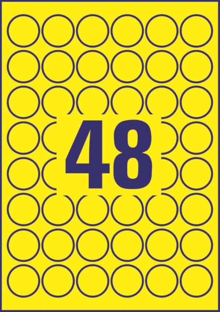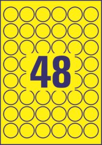průměr 30 mm, 20 archů A4, 960 ks etiket v balení (48 ks/arch), PET fólie, permanentní lepidlo, barva žlutá. Typ tiskárny: černobílá laserová.