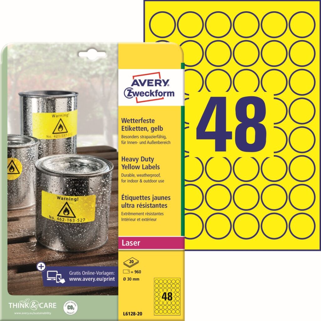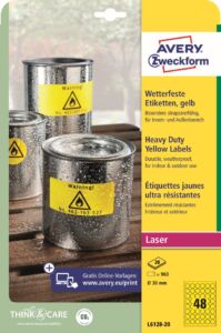 Kulaté odolné etikety Avery Zweckform L6128-20 do náročných venkovních podmínek. Ideální na trvalé a dlouhodobé značení, vnitřní i venkovní označování předmětů, výrobků, majetku, skladových regálů, palet atd. Vysoká a stálá lepivost na nejrůznějších typech povrchů. Žluté polyesterové etikety jsou odolné vůči stříkající vodě, nečistotám, mastnotě, roztržení, UV záření a teplotám od -20°C do +80°C. Při tisku se můžete spolehnout na plynulý průjezd archů tiskárnou bez uvíznutí a ostrý tiskový výstup, který se díky vynikajícímu přilnutí tonerového prášku nerozmazává. Počasí odolné PET etikety Avery Zweckform L6128-20 jsou vhodné pro všechny běžné černobílé laserové tiskárny a kopírovací stroje.
