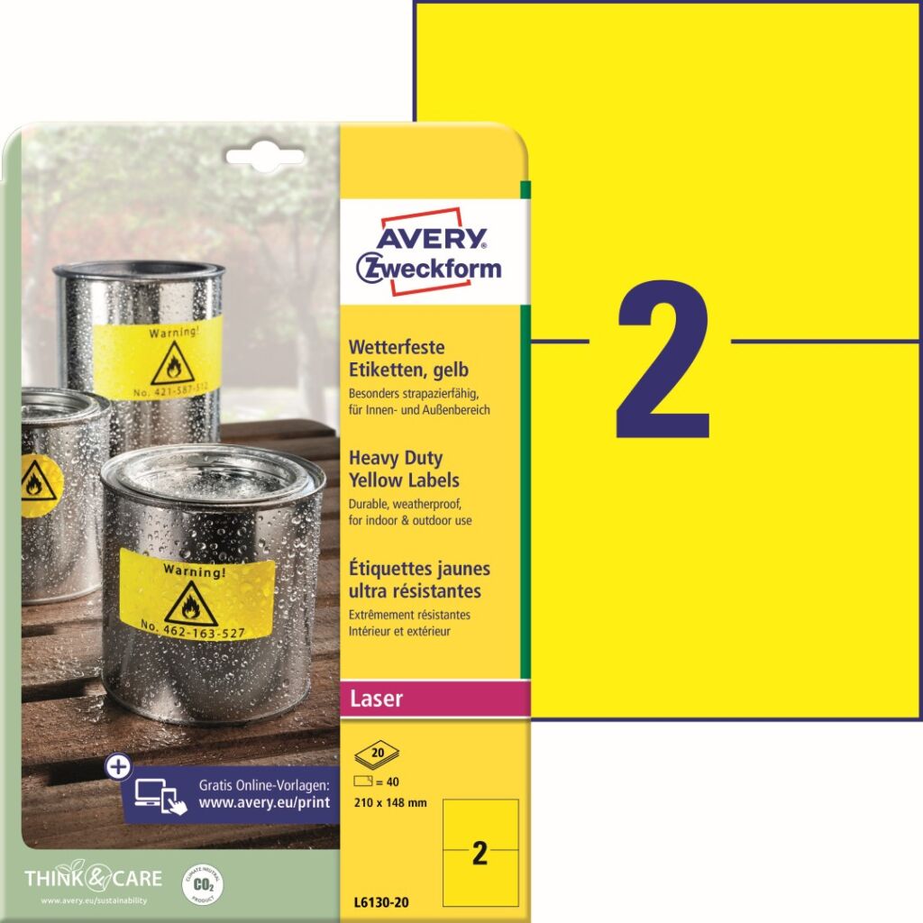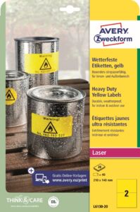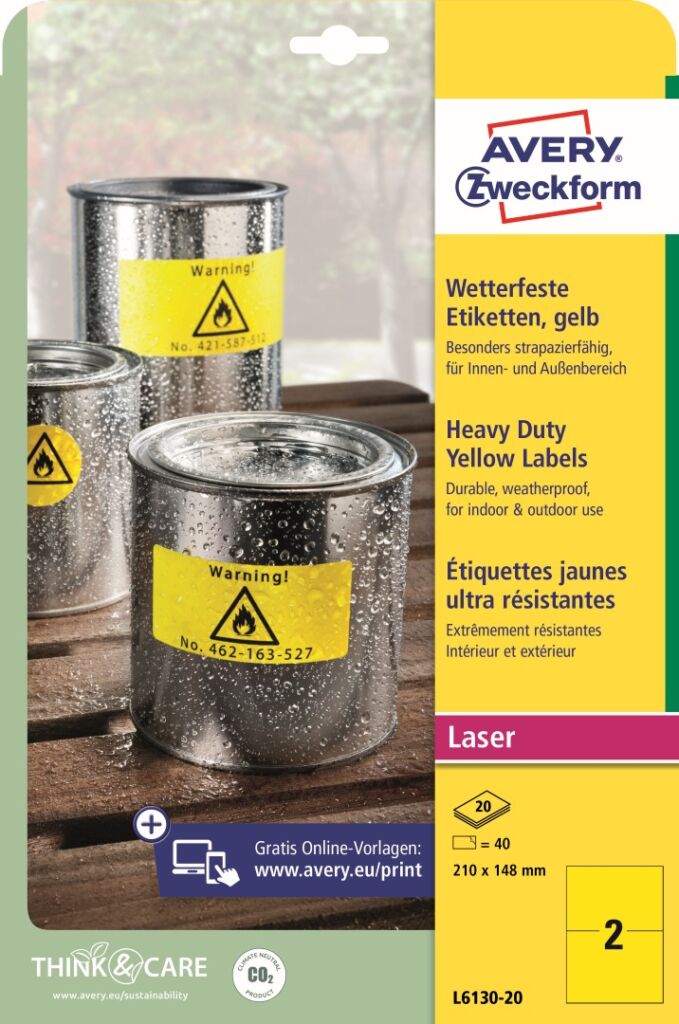Odolné samolepící etikety Avery Zweckform L6130-20 do náročných venkovních podmínek. Ideální na trvalé a dlouhodobé značení, vnitřní i venkovní označování předmětů, výrobků, majetku, skladových regálů, palet atd. Vysoká a stálá lepivost na nejrůznějších typech povrchů. Žluté polyesterové etikety jsou odolné vůči stříkající vodě, nečistotám, mastnotě, roztržení, UV záření a teplotám od -20°C do +80°C. Při tisku se můžete spolehnout na plynulý průjezd archů tiskárnou bez uvíznutí a ostrý tiskový výstup, který se díky vynikajícímu přilnutí tonerového prášku nerozmazává. Počasí odolné PET etikety Avery Zweckform L6130-20 jsou vhodné pro všechny běžné černobílé laserové tiskárny a kopírovací stroje.