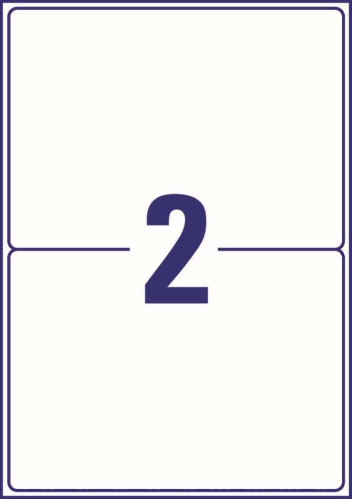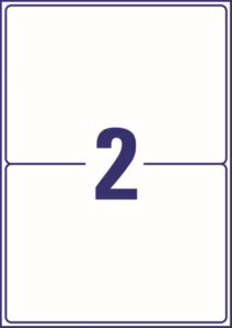 rozměr 199,6×143,5 mm, 25 archů A4, 50 ks etiket v balení (2 ks/arch), odolná polyesterová fólie, permanentní lepidlo, barva bílá. Typ tiskárny: černobílá laserová, barevná laserová.