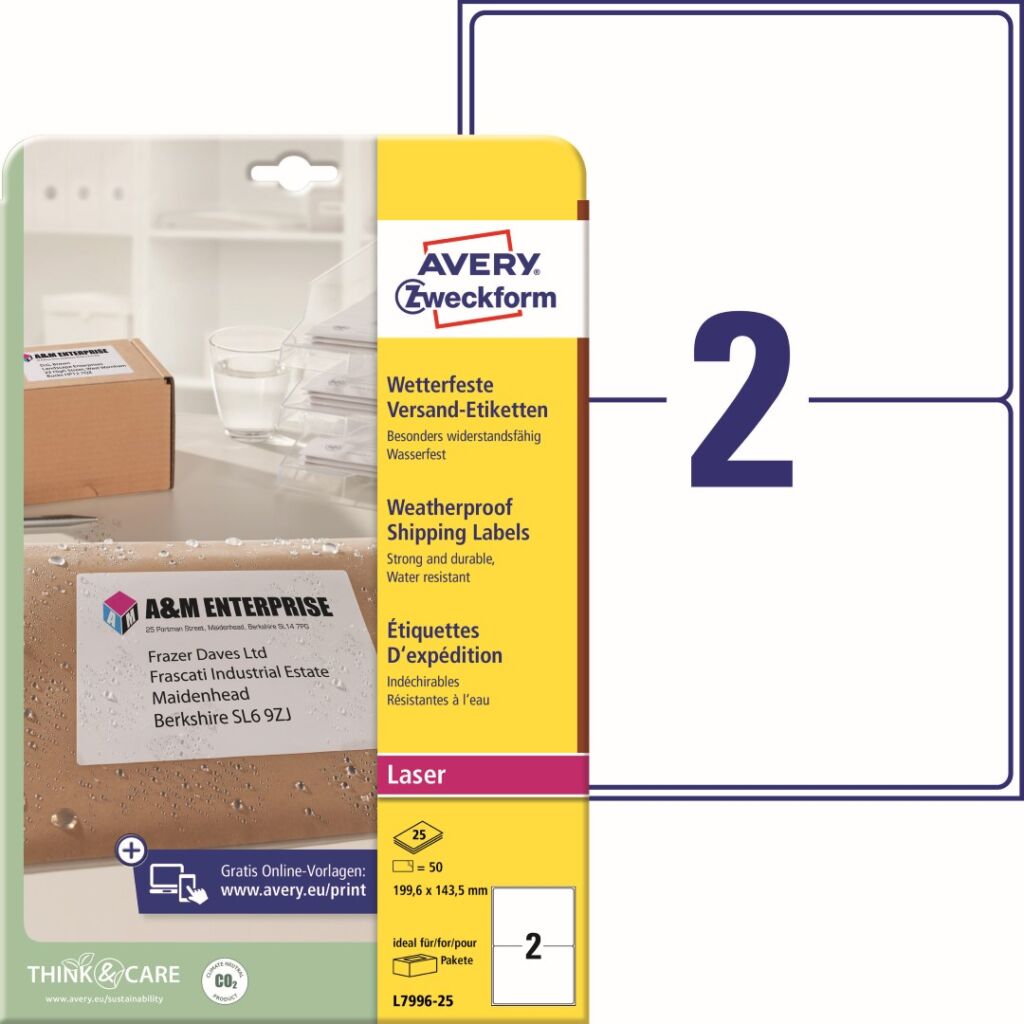 Odolné samolepící adresní etikety Avery Zweckform L7996-25 pro spolehlivé a bezpečné doručení zásilek za každého počasí. Ať už prší nebo sněží, text natištěný na této etiketě zůstane i za ztížených povětrnostních podmínek dobře čitelný. Ideální na tisk adres na obálky, zásilky, balíky, venkovní značení apod. Etikety jsou odolné vůči stříkající vodě, mastnotě, znečištění, roztržení, UV záření a teplotám od -20°C do +80°C. Vysoká a stálá lepivost ke všem běžným obalovým materiálům, obalům z polyetylénu, Tyveku atd. Při tisku se můžete spolehnout na plynulý průjezd archů tiskárnou bez uvíznutí a ostrý tiskový výstup, který se díky vynikajícímu přilnutí tonerového prášku nerozmazává. Odolné samolepící adresní štítky Avery L7996-25 jsou vhodné pro všechny běžné černobílé i barevné laserové tiskárny.