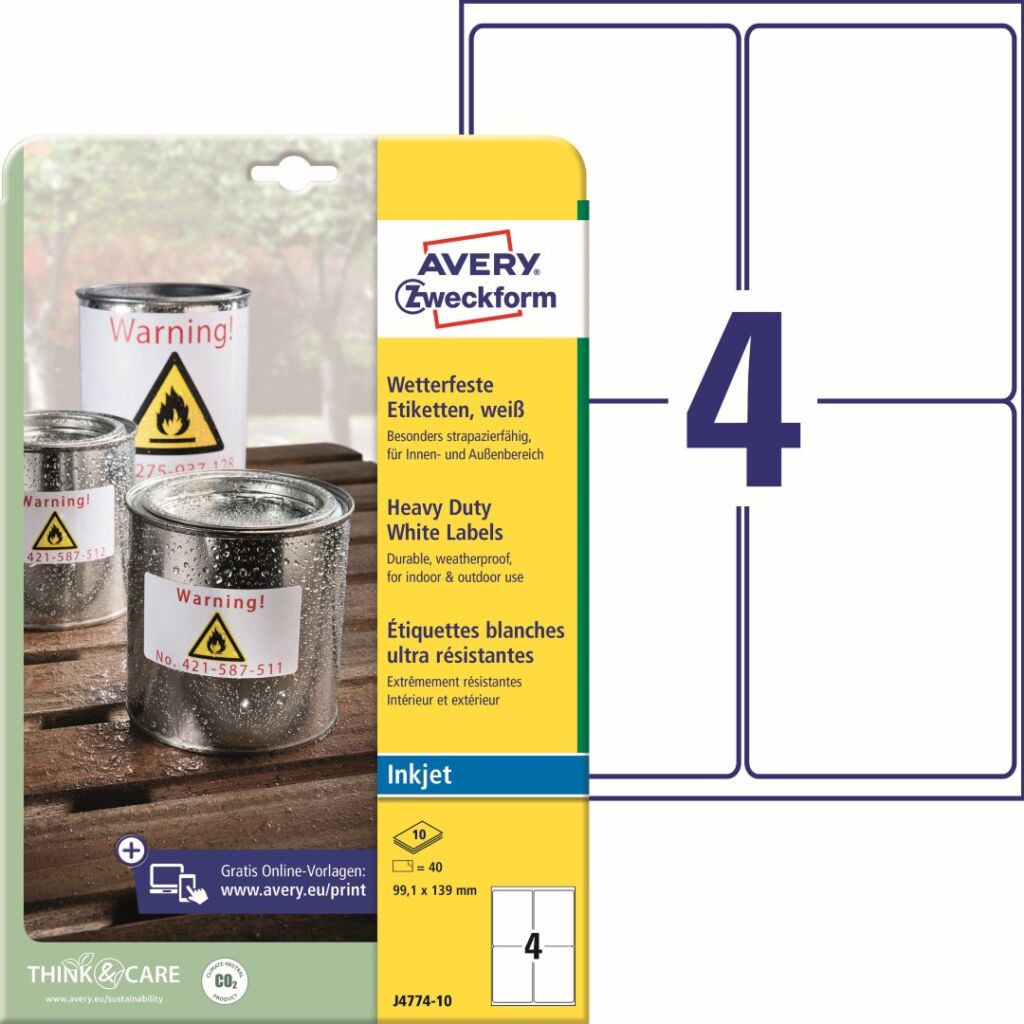 Odolné samolepící Inkjet etikety Avery Zweckform J4774-10 do náročných venkovních podmínek. Ideální na trvalé a dlouhodobé značení, vnitřní i venkovní označování předmětů, výrobků, majetku, skladových regálů, palet atd. Vysoká a stálá lepivost na nejrůznějších typech povrchů. Bílé polyesterové etikety jsou odolné vůči stříkající vodě, nečistotám, mastnotě, roztržení, UV záření a teplotám od -20°C do +80°C. Při tisku se můžete spolehnout na plynulý průjezd archů tiskárnou bez uvíznutí a ostrý tiskový výstup, který se díky vynikajícímu přilnutí tonerového prášku nerozmazává. Počasí odolné inkjet štítky Avery Zweckform J4774-10 jsou vhodné pro všechny běžné inkoustové tiskárny.