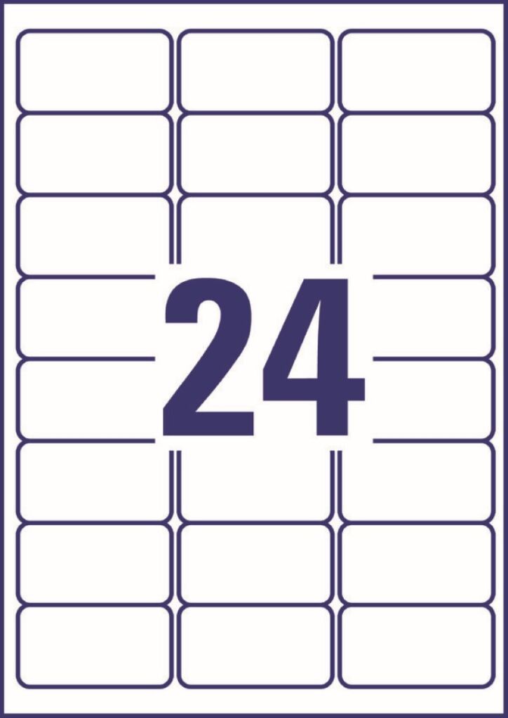20 archů A4, rozměr 63,5x33,9 mm, 480 ks etiket v balení, odolná polyesterová fólie, snímatelné lepidlo, barva bílá. Typ tiskárny: černobílá laserová, barevná laserová.