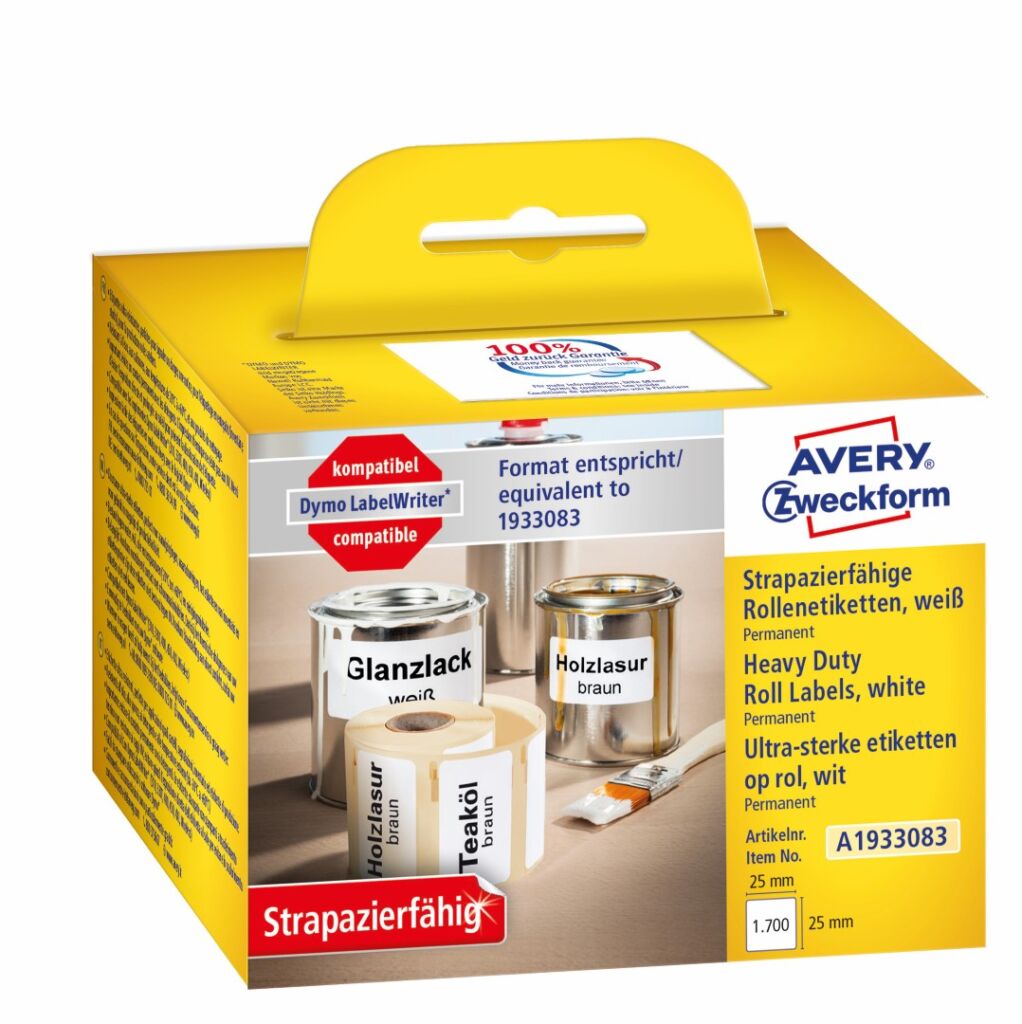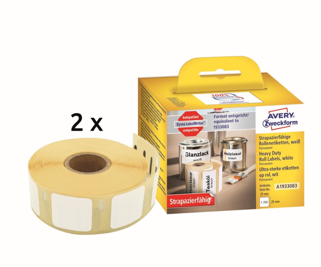 Odolné termoetikety na roli Avery Zweckform A1933083 jsou kompatibilní a cenově výhodnou náhradou za originální štítky Dymo 1933083.