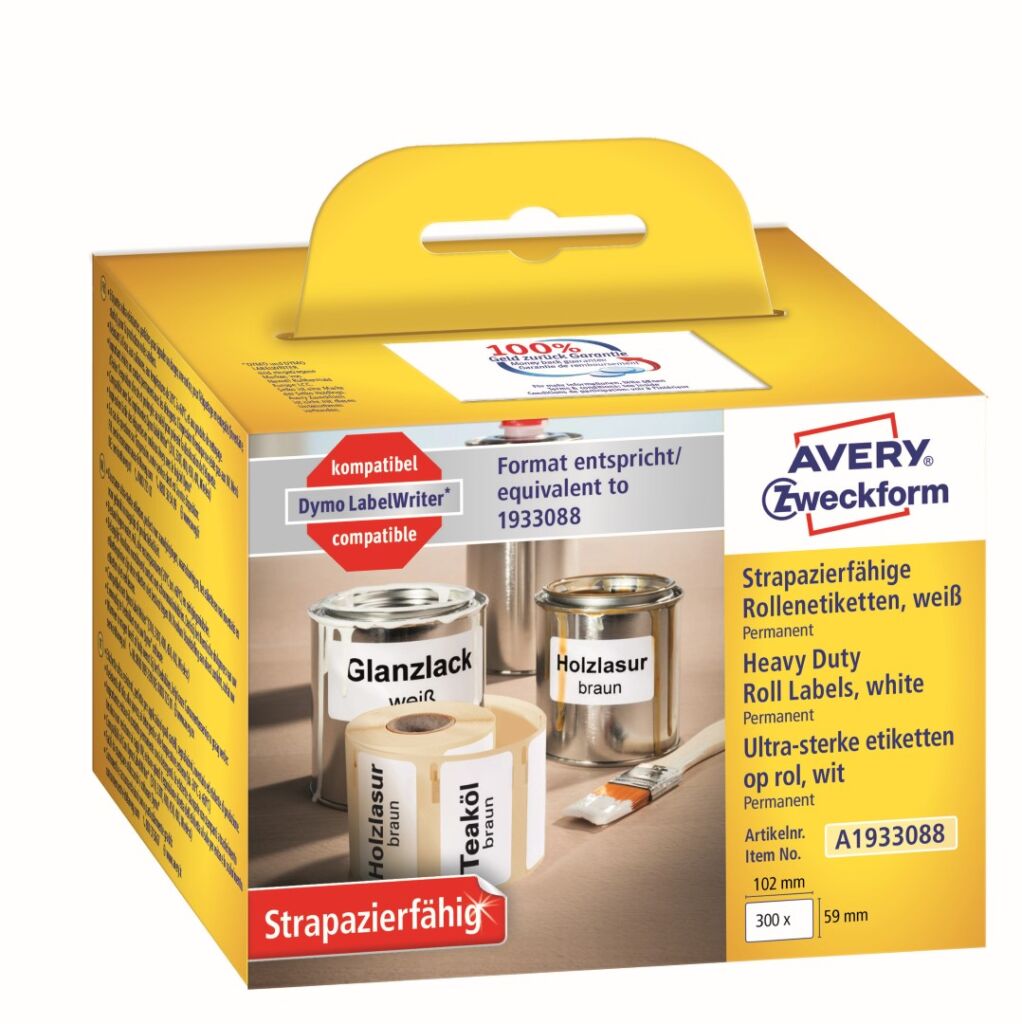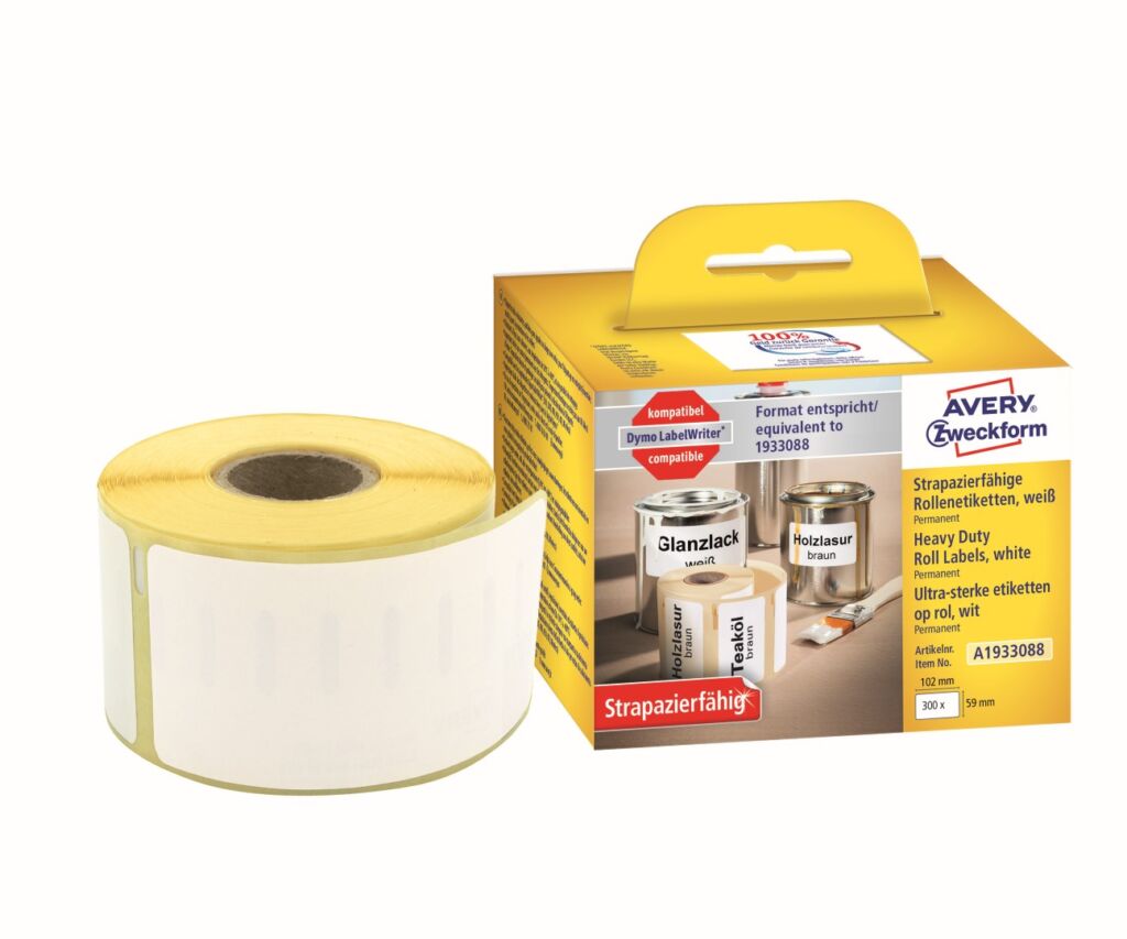 Odolné termoetikety na roli Avery Zweckform A1933088 jsou kompatibilní a cenově výhodnou náhradou za originální štítky Dymo 1933088.