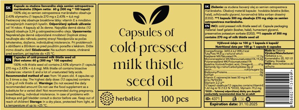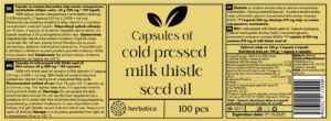 100% olej ze semen ostropestřce mariánského obsahuje 2,43% silymarinu (1 kapsle 270 mg x 2,43% = 6,6 mg)