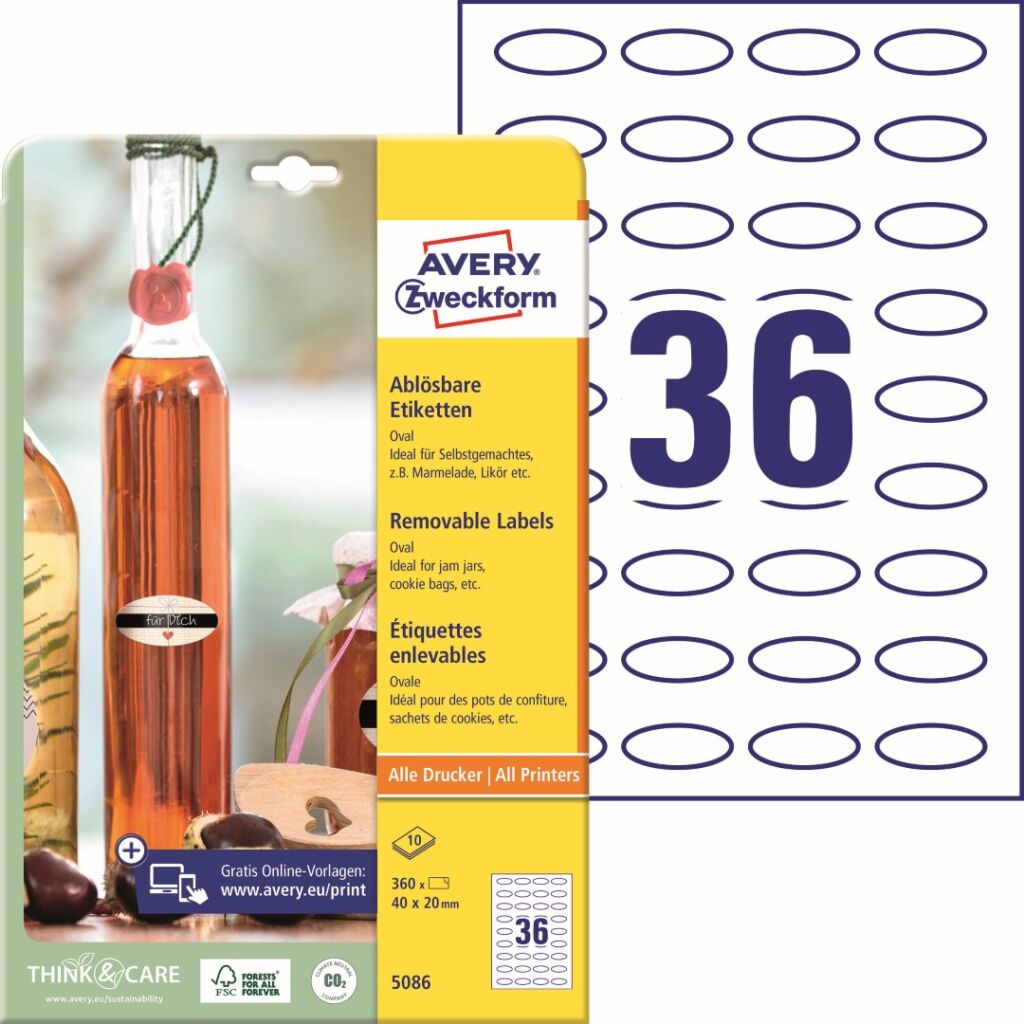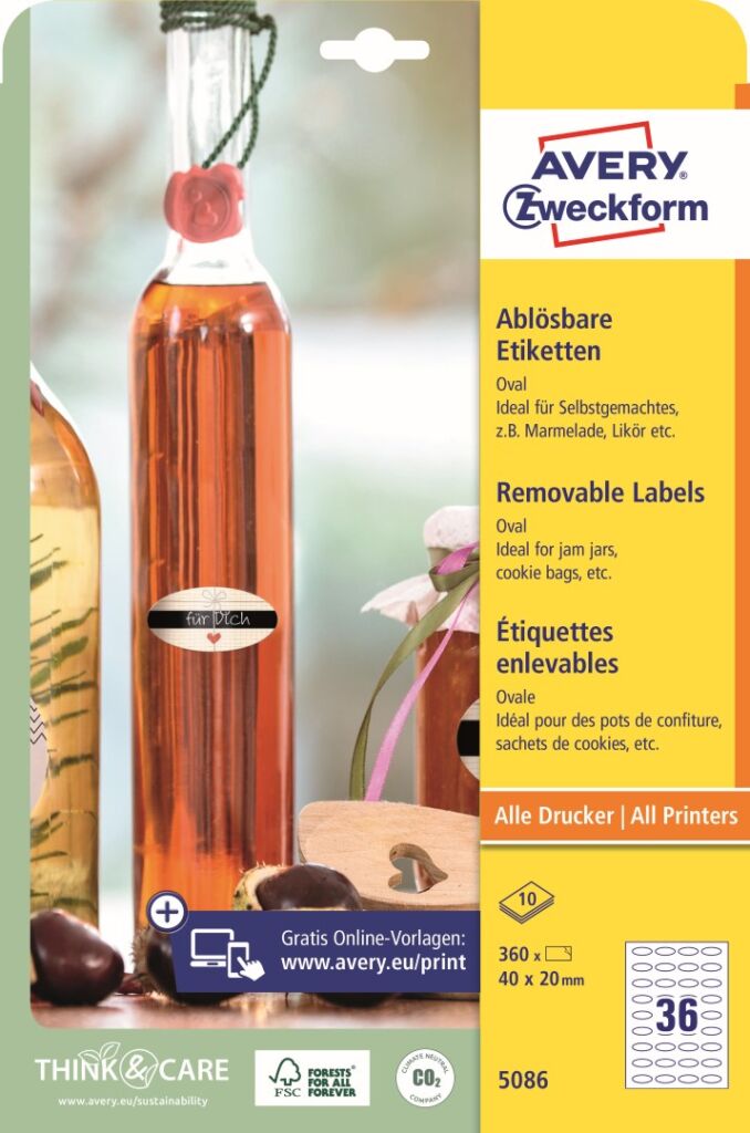 Oválné snímatelné etikety Avery Zweckform 5086 do kanceláře, obchodu i domácnosti, které vyniknou svým zvláštním tvarem a pomohou zdůraznit originalitu a jedinečnost. Ideální na veškeré dočasné nebo měnící se značení. Etikety se snímatelným lepidlem spolehlivě a bezpečně drží, a naopak je lze snadno odlepit, bez zanechání žádných stop zbytkového lepidla. Ukázka viz Videa (záložka výše). Při tisku se můžete spolehnout na plynulý průjezd archů tiskárnou bez uvíznutí a ostrý tiskový výstup, který se díky vynikajícímu ukotvení tonerového prášku nebo inkoustu nerozmazává. Samozřejmostí je čtyřstranný bezpečnostní okraj QCT (Quattro Clean Technology), který zabraňuje vytékání a usazování lepidla v tiskárně. Bílé oválné samolepky Avery Zweckform 5086 jsou vhodné pro všechny běžné laserové i inkoustové tiskárny, kopírovací stroje a hodí se i pro psaní, resp. ruční popis.