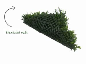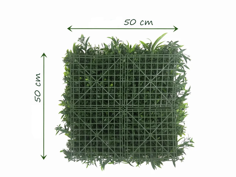 Rozměr panelu je 50x50cm. Možno využít k výrobě živých plotů, zástěn, dekoraci ploch apod. Uzpůsobeno pro snadné přichycení k podkladům jako jsou ploty apod.