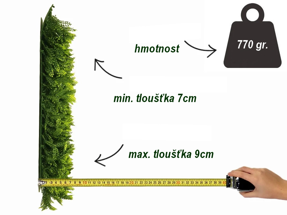 Rozměr panelu je 50x50cm. Možno využít k výrobě živých plotů, zástěn, dekoraci ploch apod. Uzpůsobeno pro snadné přichycení k podkladům jako jsou ploty apod.