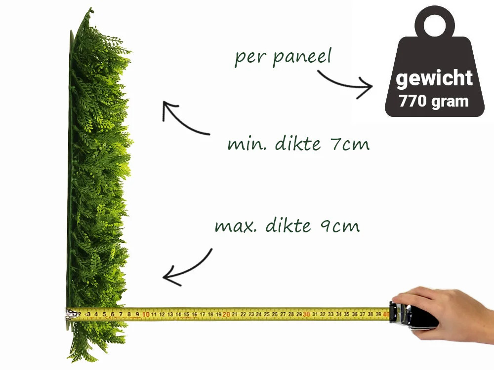 Rozměr panelu je 50x50cm. Možno využít k výrobě živých plotů, zástěn, dekoraci ploch apod. Uzpůsobeno pro snadné přichycení k podkladům jako jsou ploty apod.