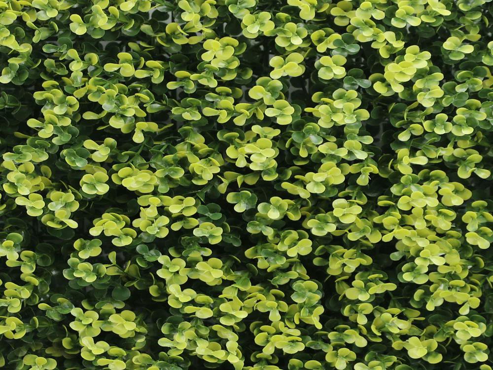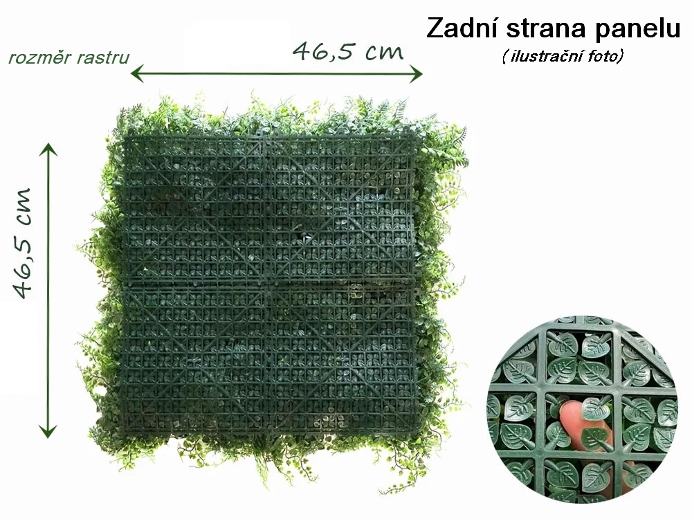 Rozměr panelu je 50x50cm. Možno využít k výrobě živých plotů, zástěn, dekoraci ploch apod. Uzpůsobeno pro snadné přichycení k podkladům jako jsou ploty apod.