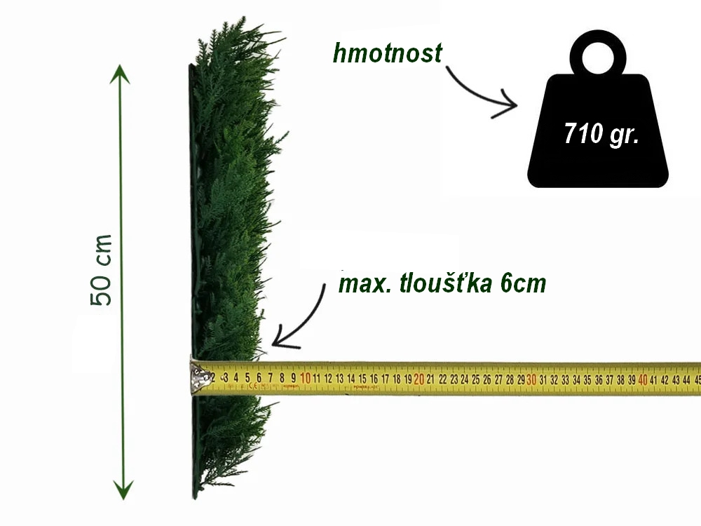 Rozměr panelu je 50x50cm. Možno využít k výrobě živých plotů, zástěn, dekoraci ploch apod. Uzpůsobeno pro snadné přichycení k podkladům jako jsou ploty apod.