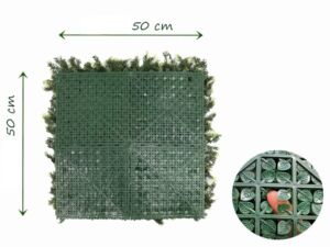Rozměr panelu je 50x50cm. Možno využít k výrobě živých plotů, zástěn, dekoraci ploch apod. Uzpůsobeno pro snadné přichycení k podkladům jako jsou ploty apod.