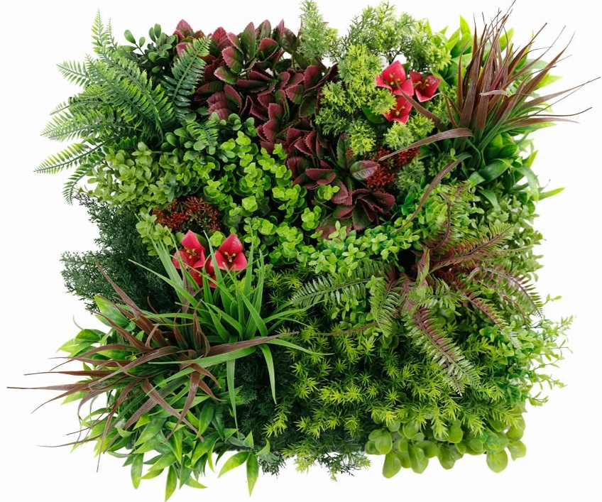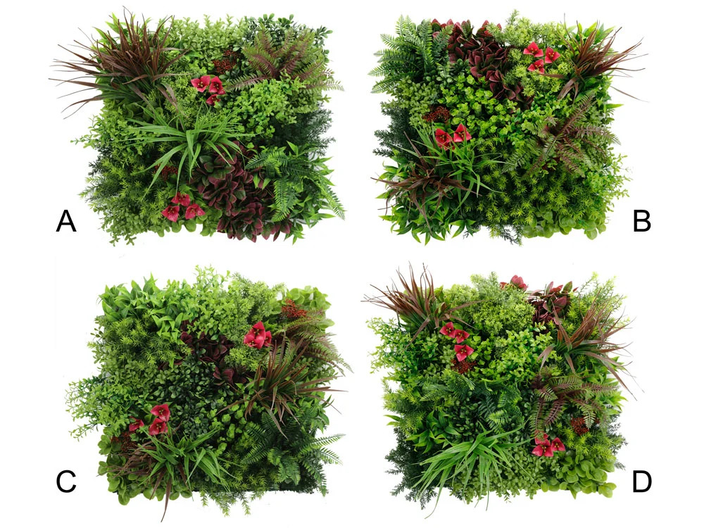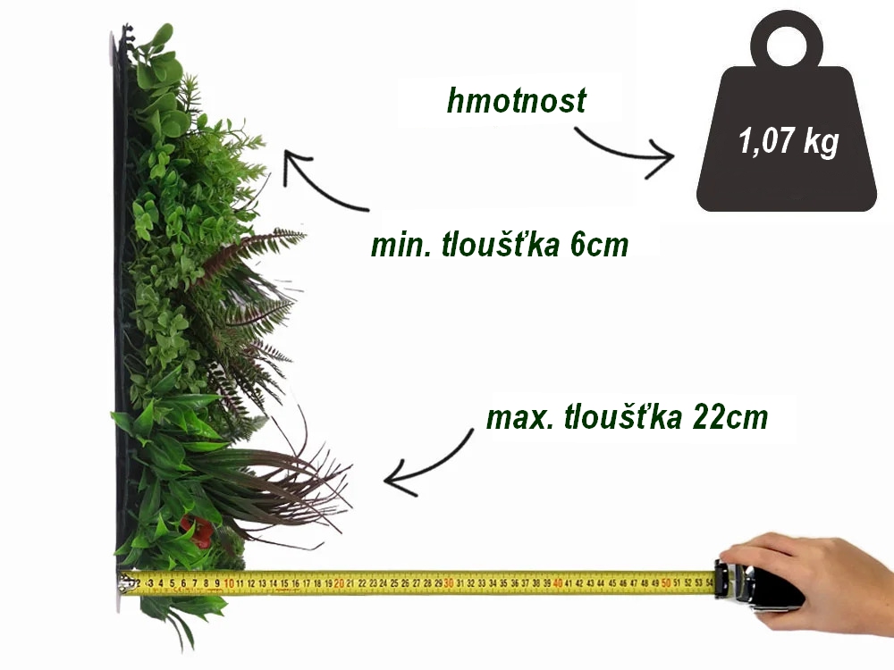 Rozměr panelu je 50x50cm. Možno využít k výrobě živých plotů, zástěn, dekoraci ploch apod. Uzpůsobeno pro snadné přichycení k podkladům jako jsou ploty apod.