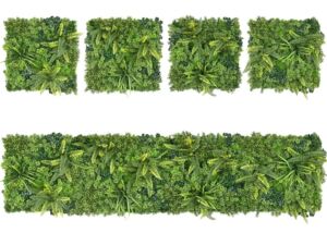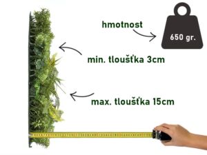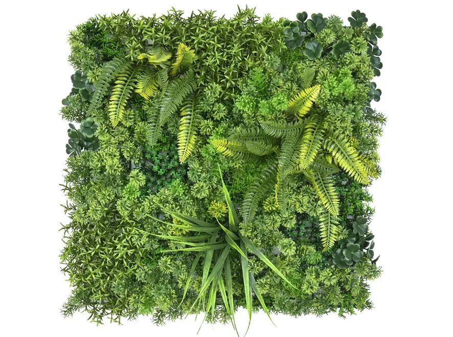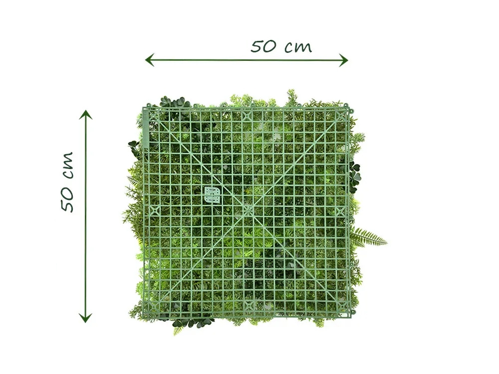 Tato umělá zelená stěna je tvořen mechovým podkladem s kombinací kapradí, draceny a drobných lístečků. Je vyroben z velmi kvalitních plastů s patentovaným blokátorem Nano-UV ©. To napomáhá udržet stálý barevný odstín po dobu nejméně 8 let.