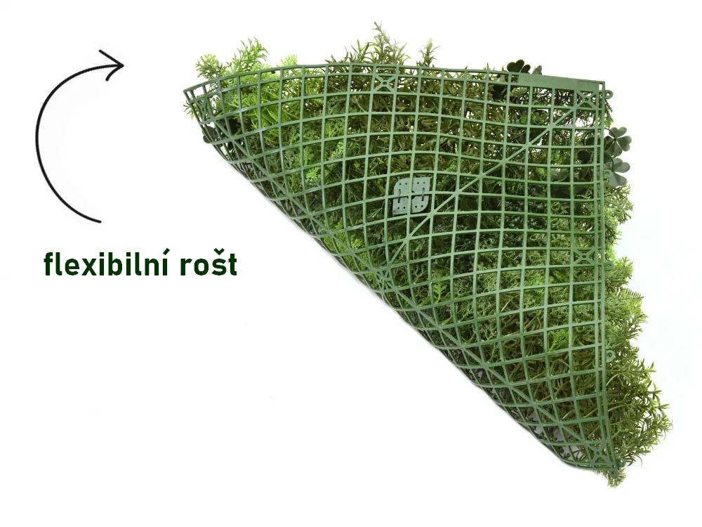 Rozměr panelu je 50x50cm. Možno využít k výrobě živých plotů, zástěn, dekoraci ploch apod. Uzpůsobeno pro snadné přichycení k podkladům jako jsou ploty apod.
