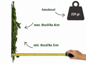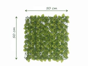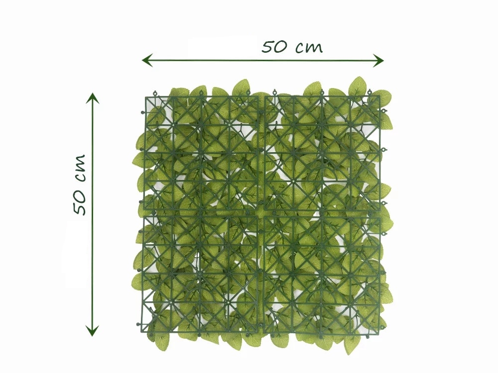 Rozměr panelu je 50x50cm. Možno využít k výrobě živých plotů, zástěn, dekoraci ploch apod. Uzpůsobeno pro snadné přichycení k podkladům jako jsou ploty apod.