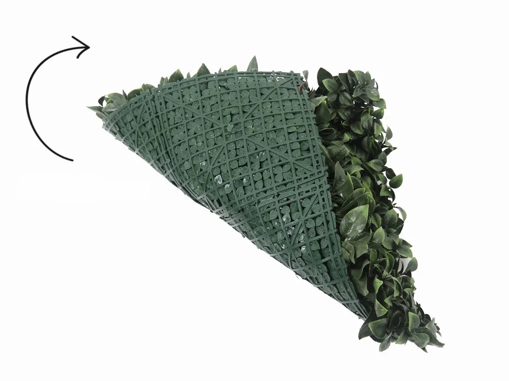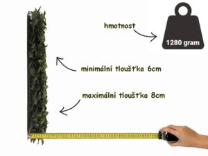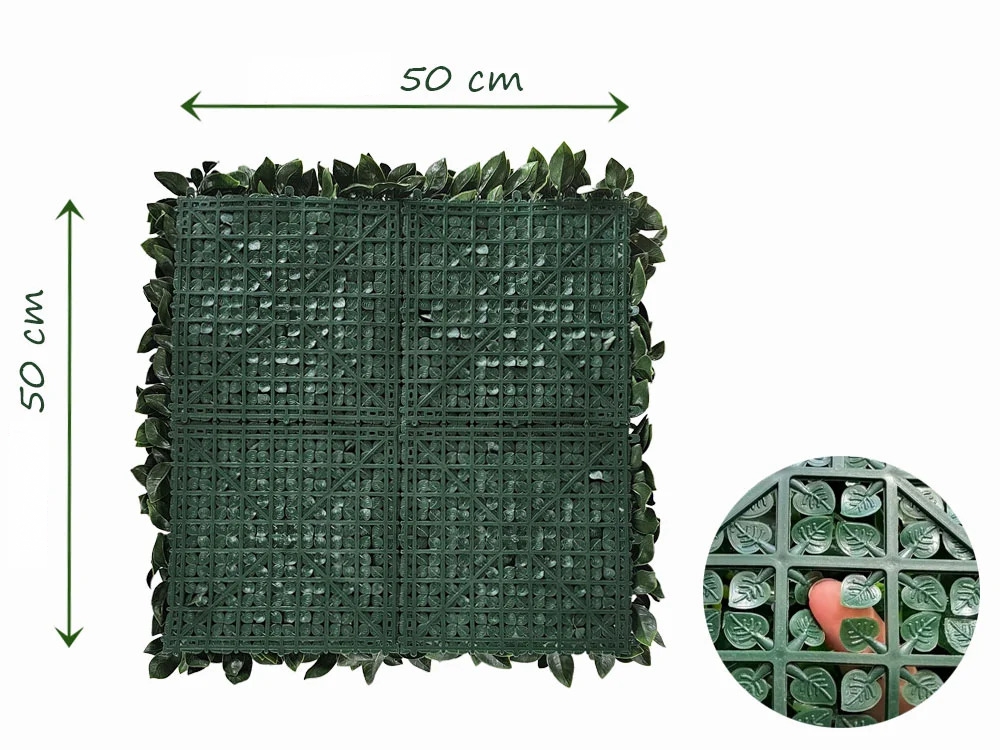 Rozměr panelu je 50x50cm. Možno využít k výrobě živých plotů, zástěn, dekoraci ploch apod. Uzpůsobeno pro snadné přichycení k podkladům jako jsou ploty apod.