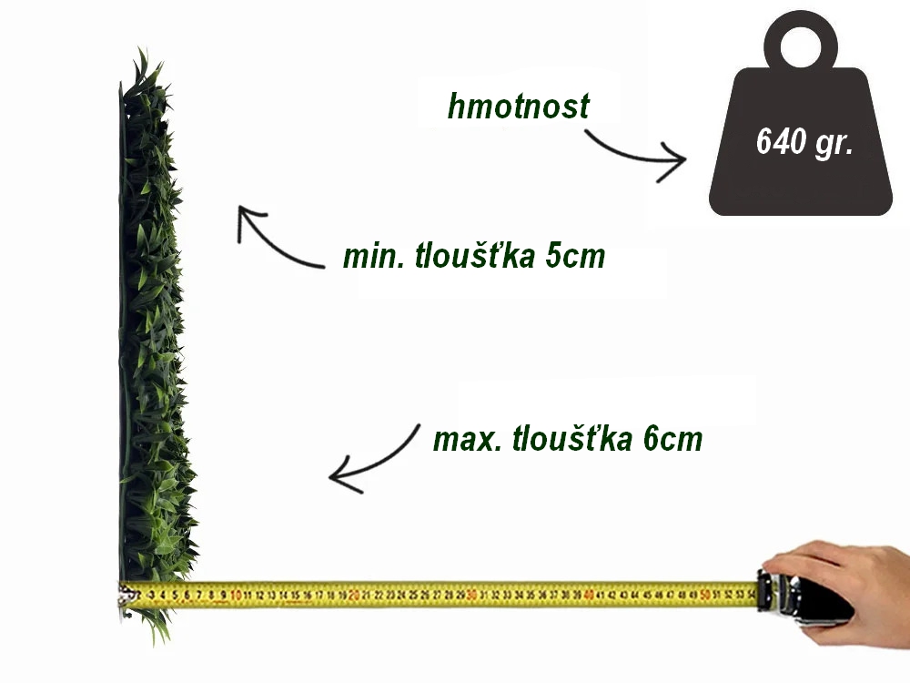 Rozměr panelu je 50x50cm. Možno využít k výrobě živých plotů, zástěn, dekoraci ploch apod. Uzpůsobeno pro snadné přichycení k podkladům jako jsou ploty apod.