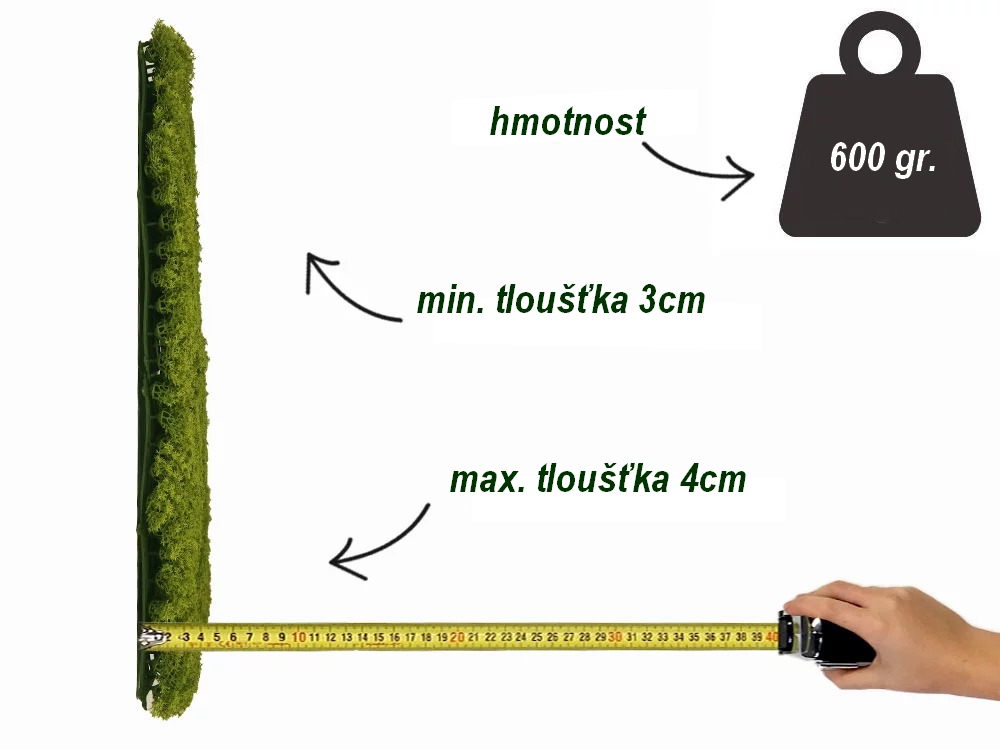 Plastový rastr, na kterém je připevněn umělý mech, měří 50 x 50 cm. Na plochu 1 čtver. metru je tedy zapotřebí 4 panelů.