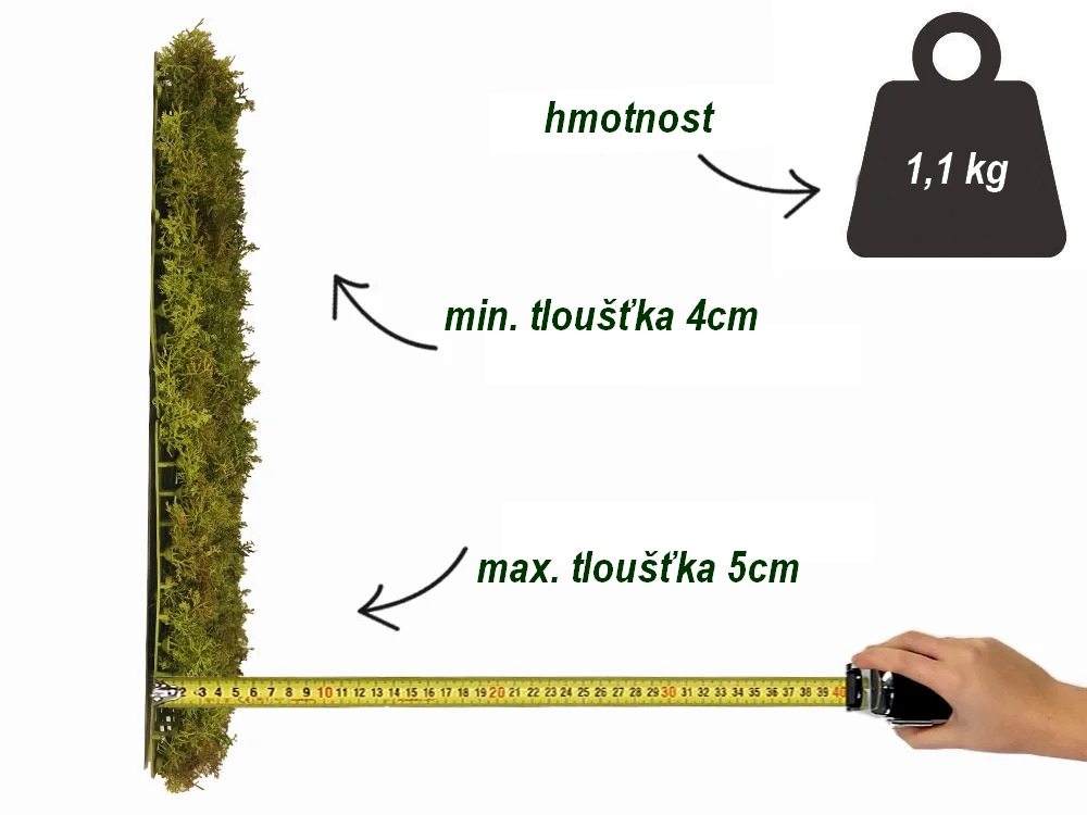 Plastový rastr, na kterém je připevněn umělý mech, měří 50 x 50 cm. Na plochu 1 čtver. metru je tedy zapotřebí 4 panelů.