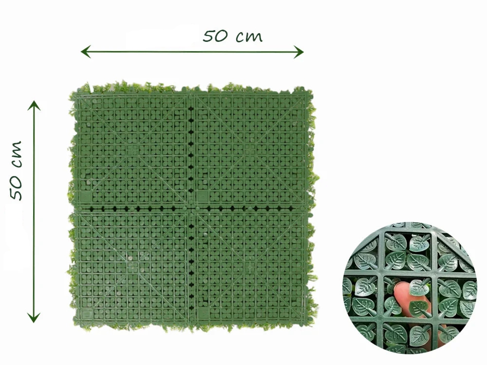 Rozměr panelu je 50x50cm. Možno využít k výrobě živých plotů, zástěn, dekoraci ploch apod. Uzpůsobeno pro snadné přichycení k podkladům jako jsou ploty apod.