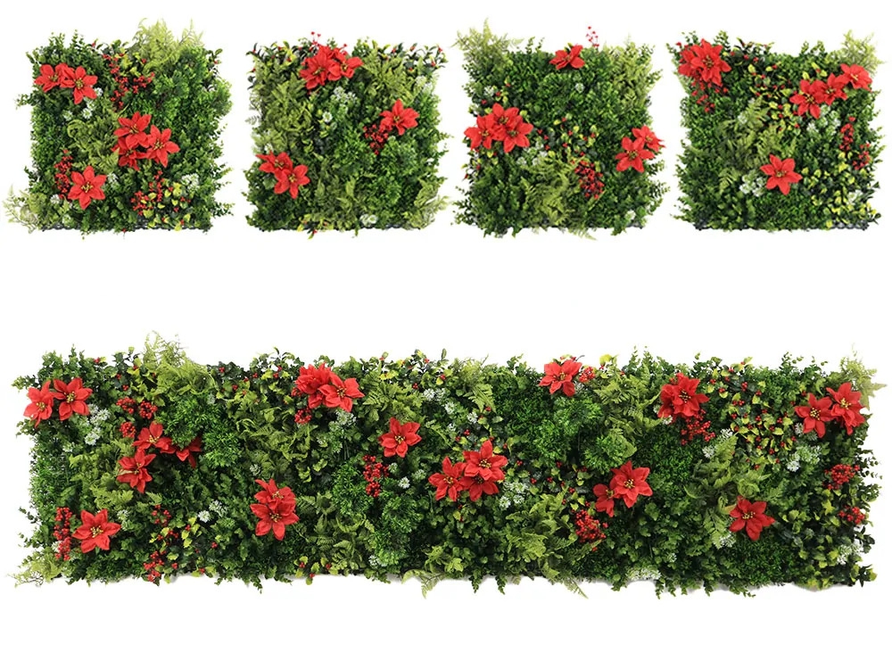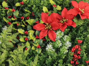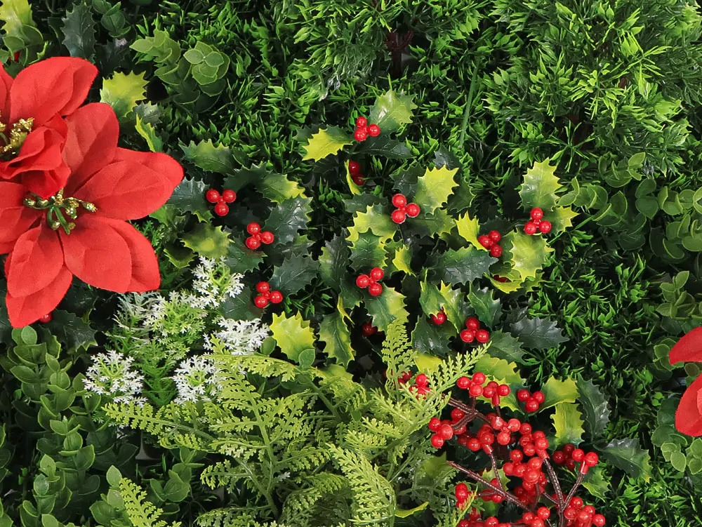 Této zelené stěně dominuje červená vánoční hvězda doplněná o červené bobule cesmíny a mech s bílými konečky.