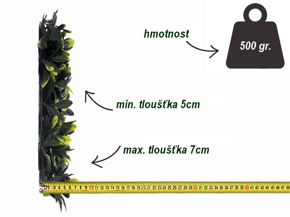 Rozměr panelu je 50x50cm. Možno využít k výrobě živých plotů, zástěn, dekoraci ploch apod. Uzpůsobeno pro snadné přichycení k podkladům jako jsou ploty apod.